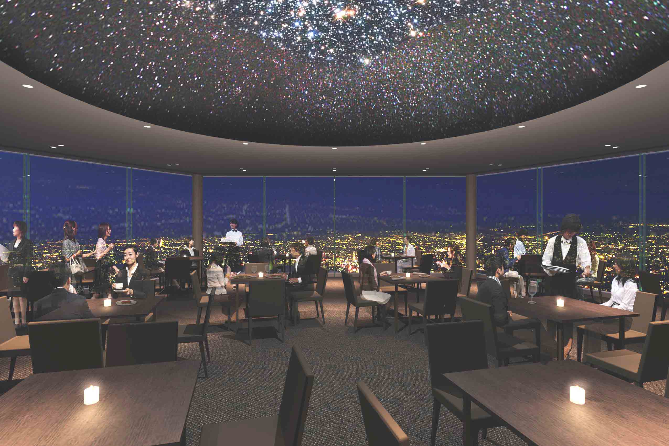レストラン「THE JEWELS」では、大平技研製の全天周映像システムにより、大平貴之作成による星空やオーロラ、雪や雲などの自然現象を再現したCG映像や、デジタルグラフィックアーティスト・KAGAYA氏※3による「スターリーテイルズ」のショートクリップなどを投影。全面ガラス張りの窓から見下ろす札幌のきらめく夜景と、繊細で美しい星空映像とのコラボレーションの元、飲食を楽しむことができます。