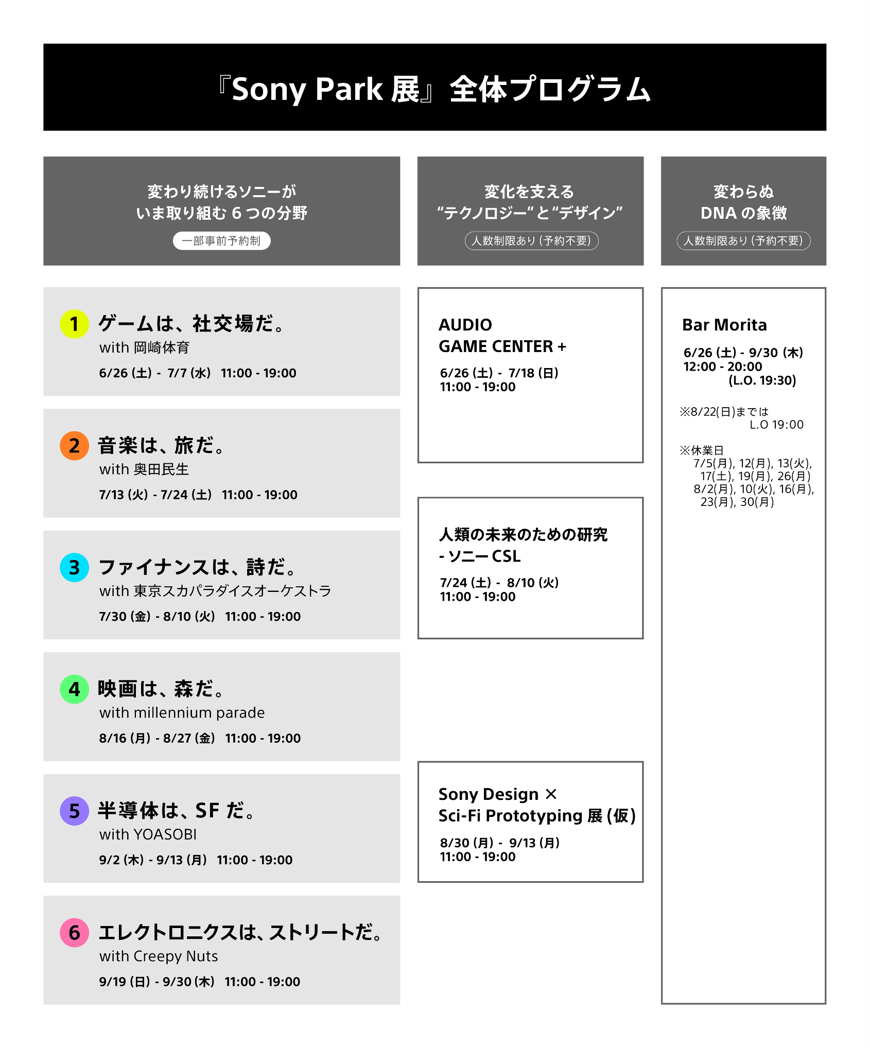 Sony Park展は、2024年に完成予定の「新Ginza Sony Park」に向けた建設工事を始める2021年10月を前に、ソニーが取り組む多様な6つの分野「ゲーム」、「⾳楽」、「ファイナンス」、「映画」、「半導体」、「エレクトロニクス」をテーマに、ソニーミュージックグループに所属する6組のアーティストが加わって展開するファイナルプログラム。それぞれの分野を「ゲームは、社交場だ。」、「音楽は、旅だ。」、「ファイナンスは、詩だ。」、「 映画は、森だ。」、「半導体は、SFだ。」、「エレクトロニクスは、ストリートだ。」の6つに変換し、遊び⼼と挑戦⼼溢れるアーティストたちとここだけのプログラムを展開します。