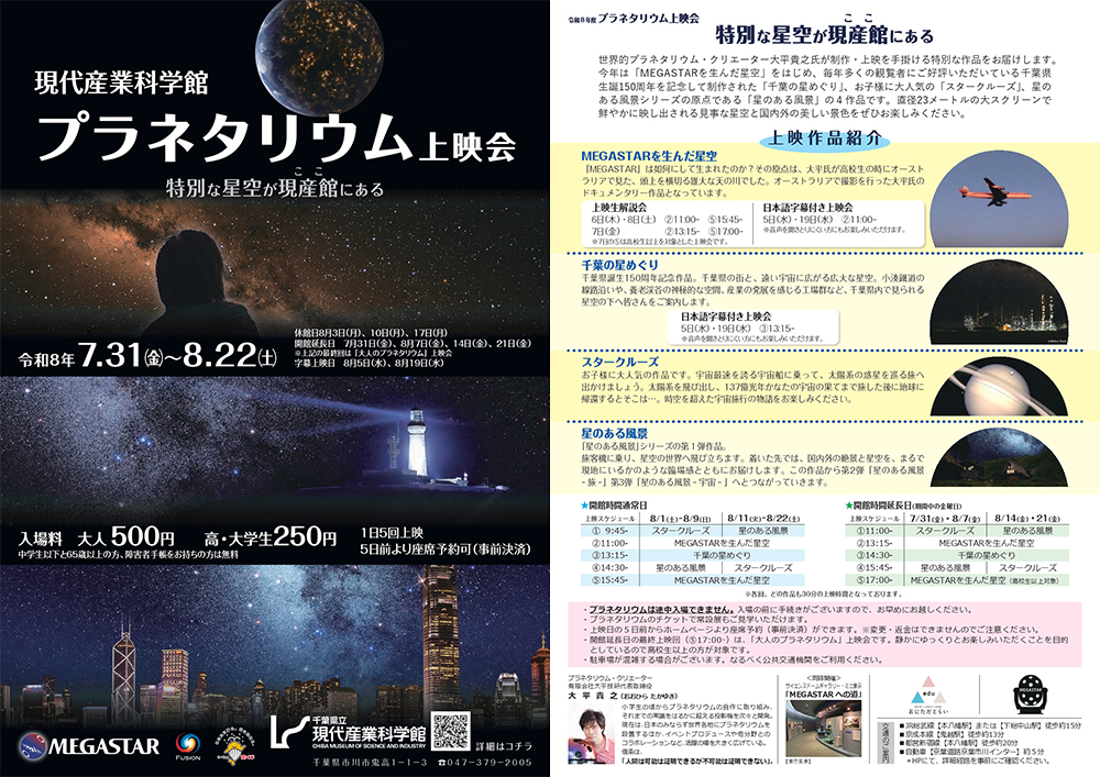 毎年恒例、千葉県立現代産業科学館で令和8年度プラネタリウム上映会「特別な星空が現産館(ここ)にある」MEGASTAR-FUSIONを行います。