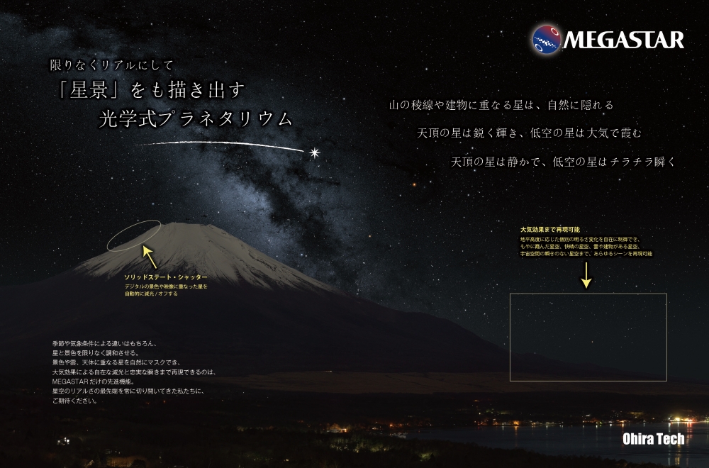 また、ソリッドステート・シャッターによりデジタル映像に星が重なることがないため、背景の山や建物に星が映るなどの不自然な映像表現を避けることができます。ハイブリッド式プラネタリウムとして最適な仕様になっております。